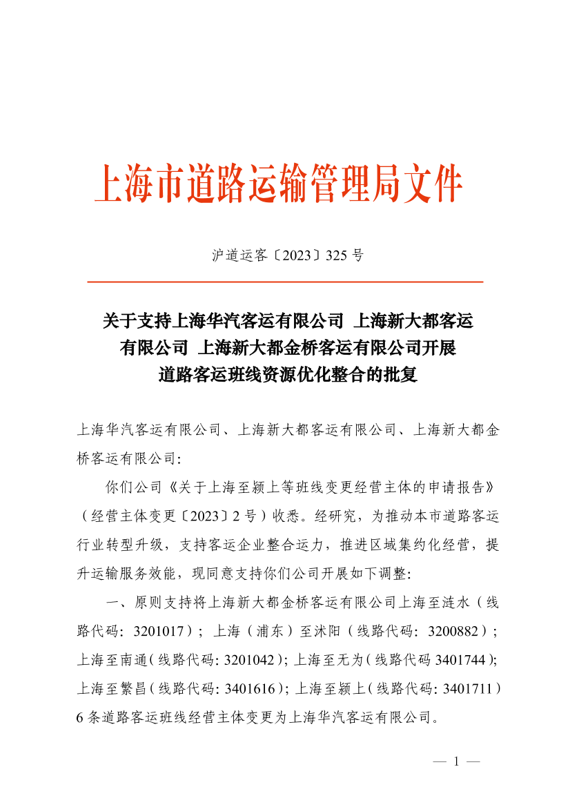 一、原则支持将上海新大都金桥客运有限公司上海至涟水(线路代码:3201017);上海(浦东)至沭阳(线路代码:3200882);上海至南通(线路代码:3201042);上海至无为(线路代码3401744);上海至繁昌(线路代码:3401616);上海至颍上(线路代码:3401711)6条道路客运班线经营主体变更为上海华汽客运有限公司。