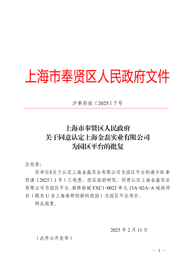 你单位《关于认定上海金磊实业有限公司为园区平台的请示》(奉经请〔2025〕1号)已收悉。经区政府研究,同意认定上海金磊实业有限公司为园区平台。南桥新城FXC1-0022单元13A-02A-A地块项目(联东U谷上海南桥创新科技园)为园区平台项目。