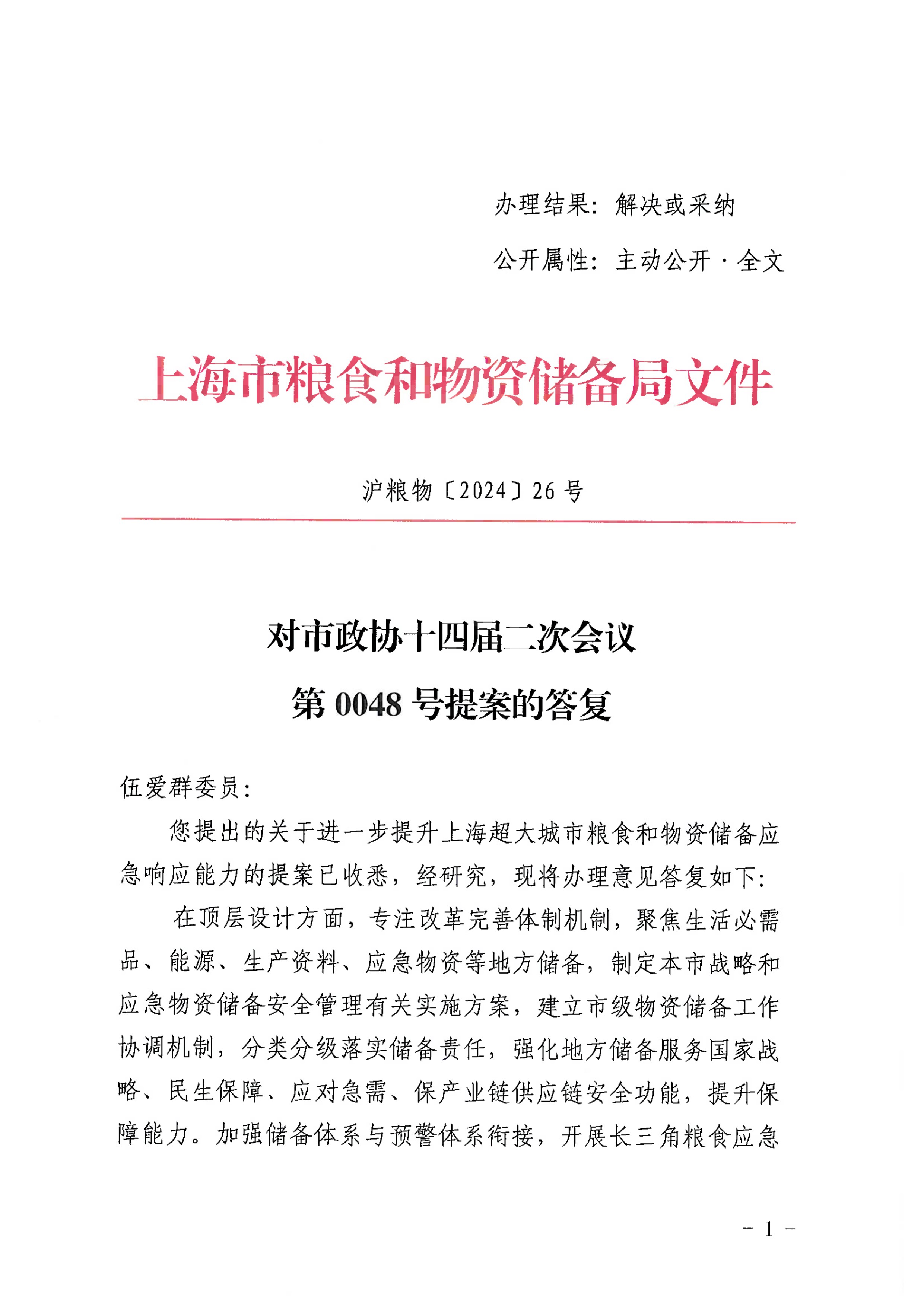 您提出的关于进一步提升上海超大城市粮食和物资储备应急响应能力的提案已收悉,经研究,现将办理意见答复如下: