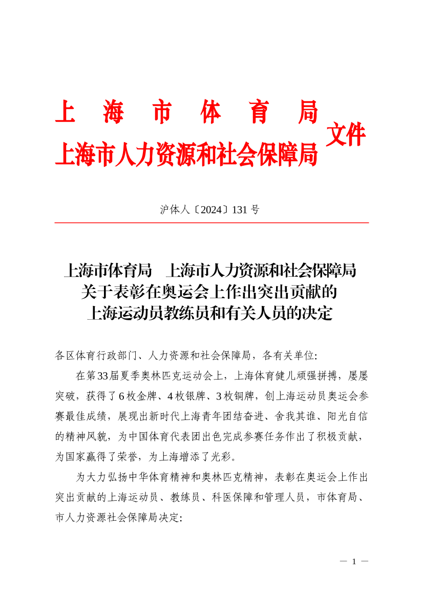 为大力弘扬中华体育精神和奥林匹克精神,表彰在奥运会上作出突出贡献的上海运动员、教练员、科医保障和管理人员,市体育局、市人力资源社会保障局决定:
