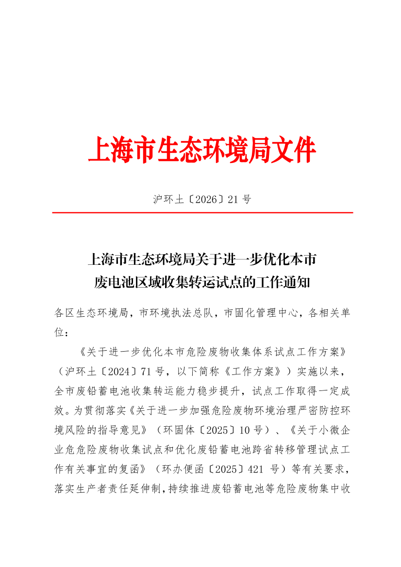 《关于进一步优化本市危险废物收集体系试点工作方案》(沪环土〔2024〕71号,以下简称《工作方案》)实施以来,全市废铅蓄电池收集转运能力稳步提升,试点工作取得一定成效。为贯彻落实《关于进一步加强危险废物环境治理严密防控环境风险的指导意见》(环固体〔2025〕10号)、《关于小微企业危危险废物收集试点和优化废铅蓄电池跨省转移管理试点工作有关事宜的复函》(环办便函〔2025〕421 号)等有关要求,落实生产者责任延伸制,持续推进废铅蓄电池等危险废物集中收集和区域转运,决定在全市继续开展收集转运试点工作。现将有关要求通知如下: