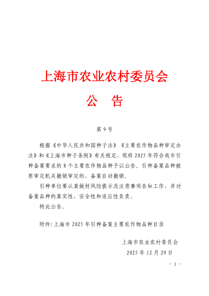 根据《中华人民共和国种子法》《主要农作物品种审定办法》和《上海市种子条例》有关规定,现将2025年符合我市引种备案要求的8个主要农作物品种予以公告。引种备案品种被原审定机关撤销审定的,备案自动撤销。