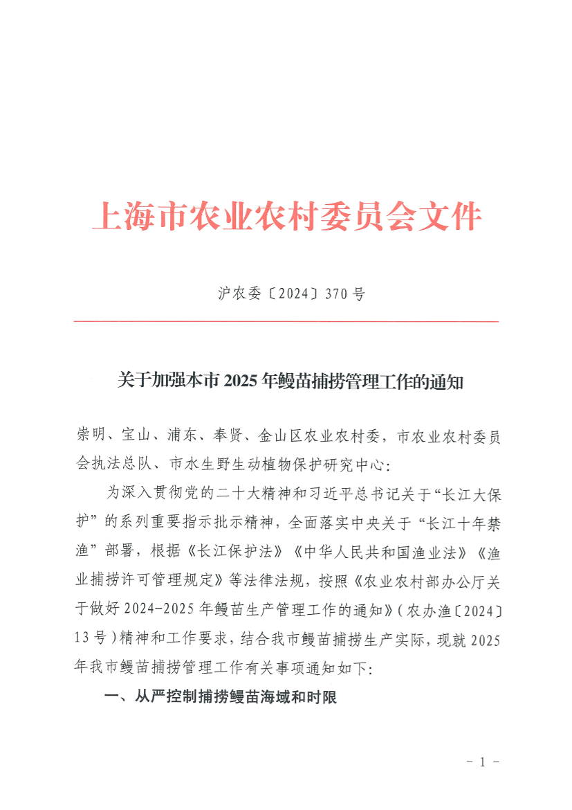 为深入贯彻党的二十大精神和习近平总书记关于“长江大保护”的系列重要指示批示精神,全面落实中央关于“长江十年禁渔”部署,根据《中华人民共和国长江保护法》《中华人民共和国渔业法》《渔业捕捞许可管理规定》等法律法规,按照《农业农村部办公厅关于做好2024-2025年鳗苗生产管理工作的通知》(农办渔〔2024〕13号)精神和工作要求,结合我市鳗苗捕捞生产实际,现就2025年我市鳗苗捕捞管理工作有关事项通知如下: