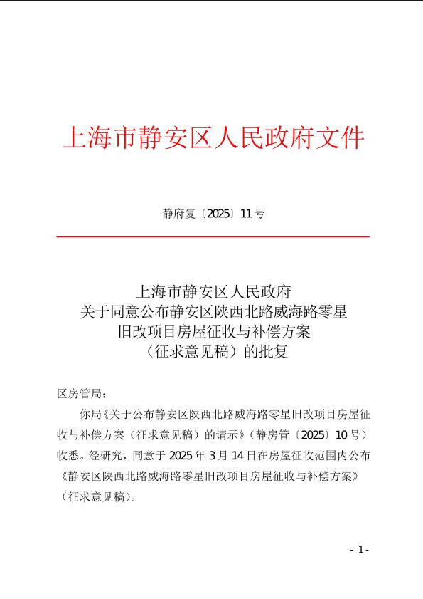 你局《关于公布静安区陕西北路威海路零星旧改项目房屋征收与补偿方案(征求意见稿)的请示》(静房管〔2025〕10号)收悉。经研究,同意于2025年3月14日在房屋征收范围内公布《静安区陕西北路威海路零星旧改项目房屋征收与补偿方案》(征求意见稿)。