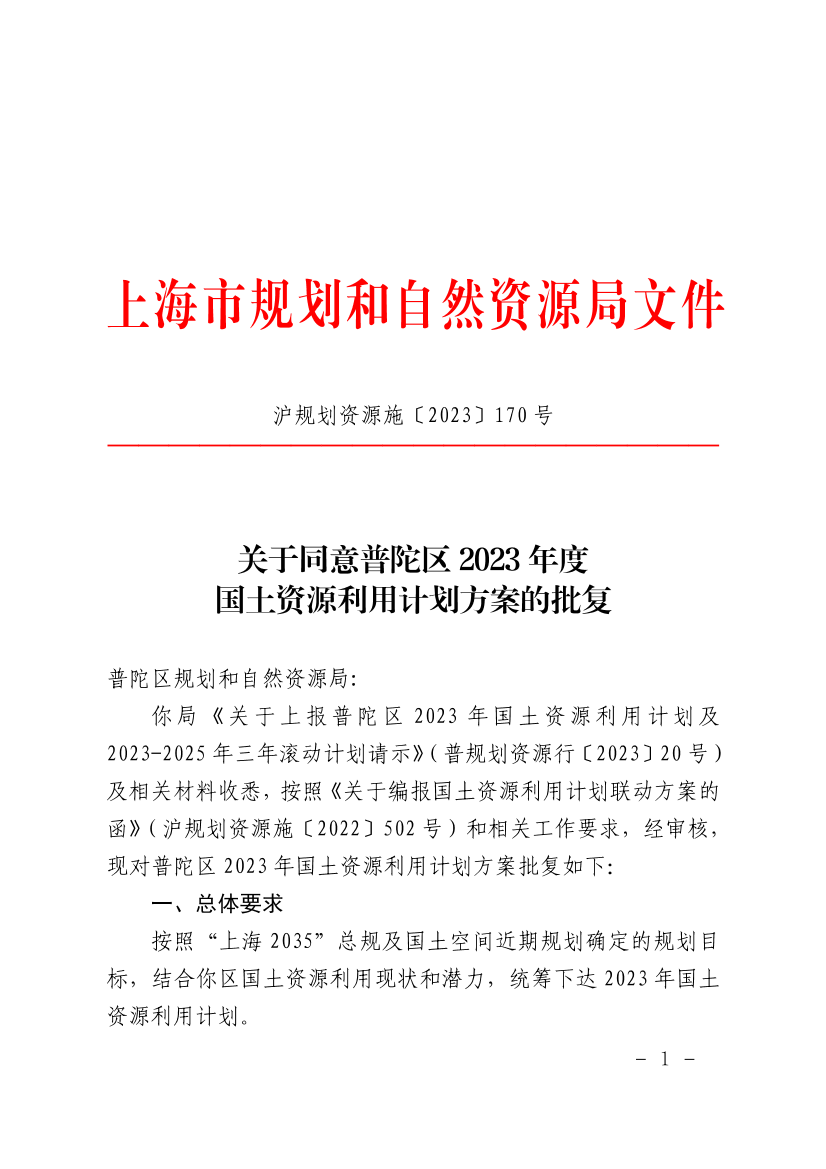 你局《关于上报普陀区2023年国土资源利用计划及2023-2025年三年滚动计划请示》(普规划资源行〔2023〕20号)及相关材料收悉,按照《关于编报国土资源利用计划联动方案的函》(沪规划资源施〔2022〕502号)和相关工作要求,经审核,现对普陀区2023年国土资源利用计划方案批复如下: