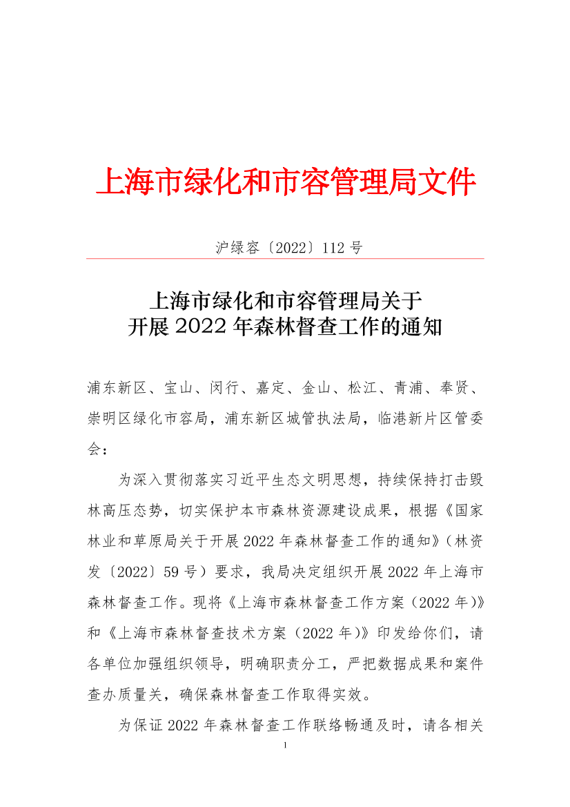 为深入贯彻落实习近平生态文明思想,持续保持打击毁林高压态势,切实保护本市森林资源建设成果,根据《国家林业和草原局关于开展2022年森林督查工作的通知》(林资发〔2022〕59号)要求,我局决定组织开展2022年上海市森林督查工作。现将《上海市森林督查工作方案(2022年)》和《上海市森林督查技术方案(2022年)》印发给你们,请各单位加强组织领导,明确职责分工,严把数据成果和案件查办质量关,确保森林督查工作取得实效。