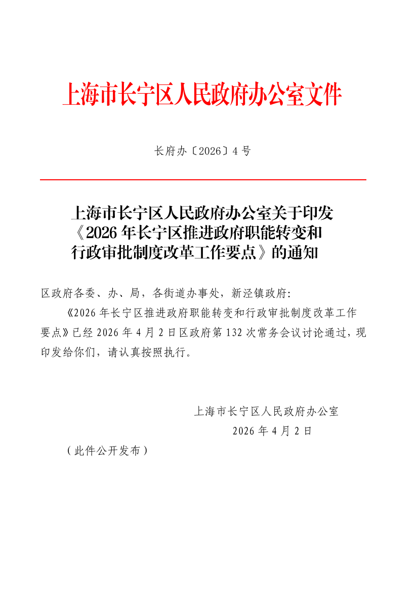 《2026年长宁区推进政府职能转变和行政审批制度改革工作要点》已经2026年4月2日区政府第132次常务会议讨论通过,现印发给你们,请认真按照执行。