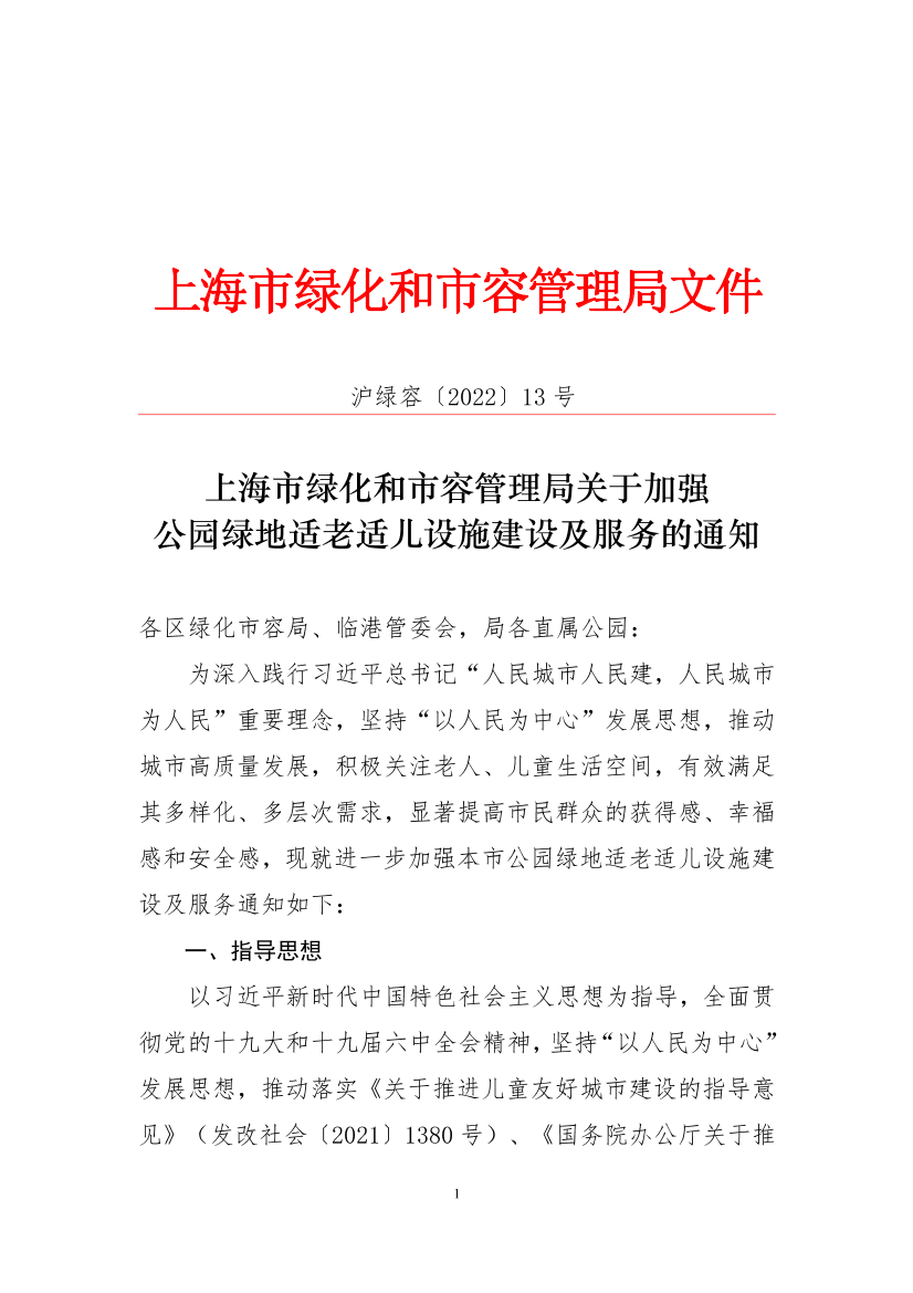 为深入践行习近平总书记“人民城市人民建,人民城市为人民”重要理念,坚持“以人民为中心”发展思想,推动城市高质量发展,积极关注老人、儿童生活空间,有效满足其多样化、多层次需求,显著提高市民群众的获得感、幸福感和安全感,现就进一步加强本市公园绿地适老适儿设施建设及服务通知如下: