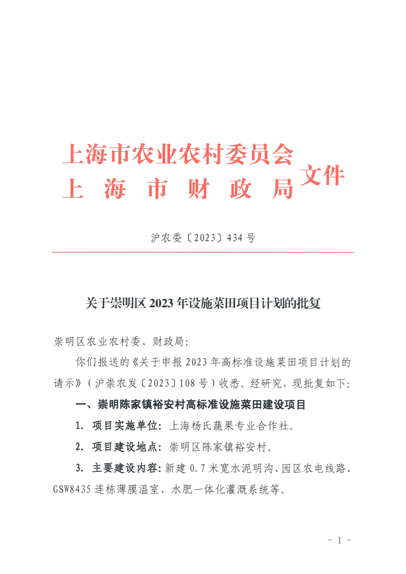 你们报送的《关于申报2023年高标准设施菜田项目计划的请示》(沪崇农发〔2023〕108号)收悉。经研究,现批复如下: