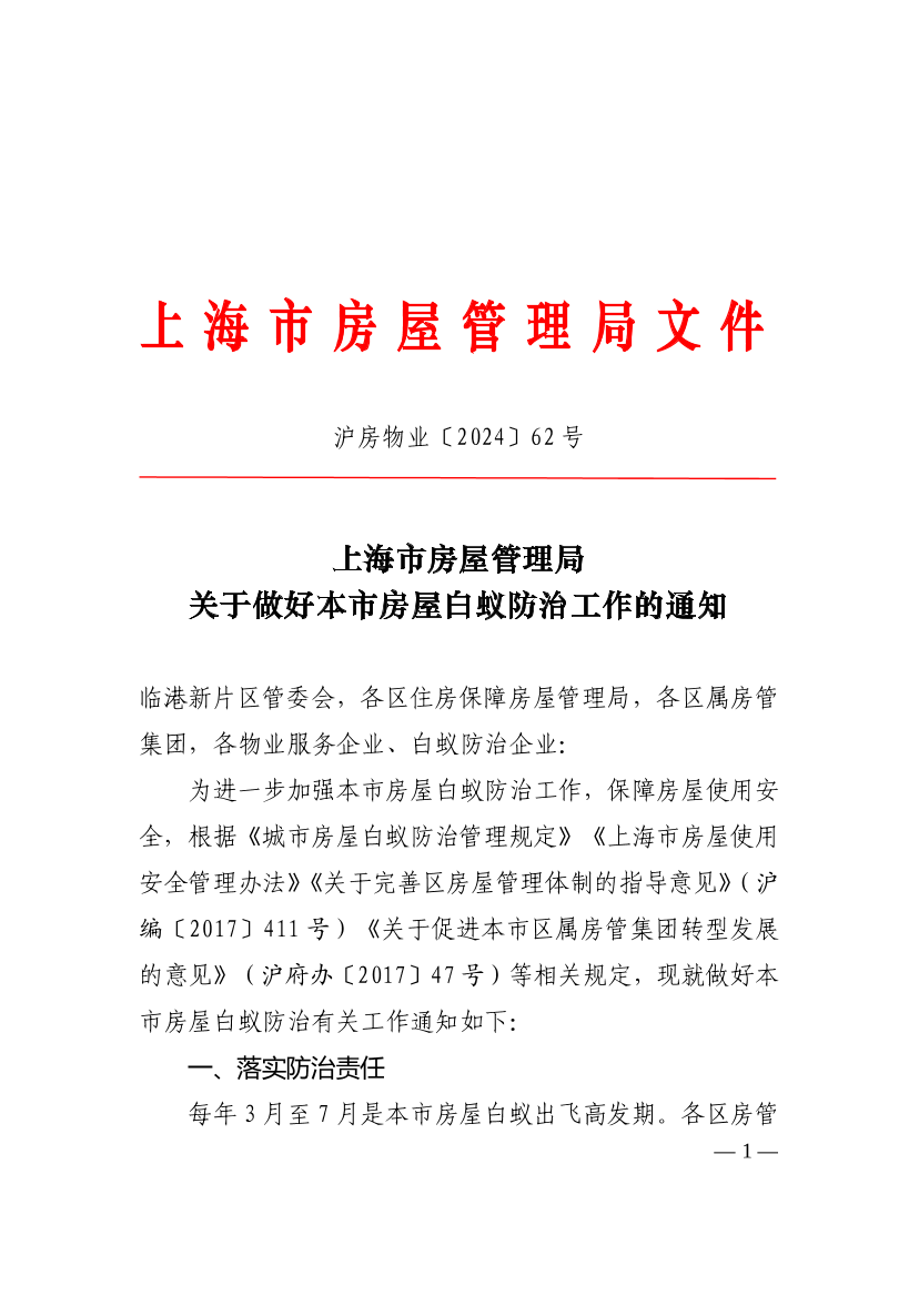 为进一步加强本市房屋白蚁防治工作,保障房屋使用安全,根据《城市房屋白蚁防治管理规定》《上海市房屋使用安全管理办法》《关于完善区房屋管理体制的指导意见》(沪编〔2017〕411号)《关于促进本市区属房管集团转型发展的意见》(沪府办〔2017〕47号)等相关规定,现就做好本市房屋白蚁防治有关工作通知如下: