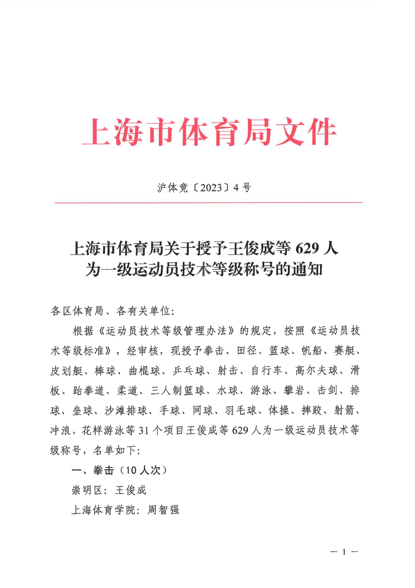 根据《运动员技术等级管理办法》的规定,按照《运动员技术等级标准》,经审核,现授予拳击、田径、篮球、帆船、赛艇、皮划艇、棒球、曲棍球、乒乓球、射击、自行车、高尔夫球、滑板、跆拳道、柔道、三人制篮球、水球、游泳、攀岩、击剑、排球、垒球、沙滩排球、手球、网球、羽毛球、体操、摔跤、射箭、冲浪、花样游泳等31个项目王俊成等629人为一级运动员技术等级称号,名单如下: