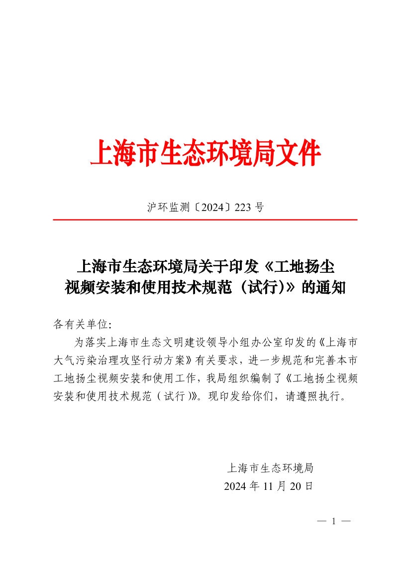 为落实上海市生态文明建设领导小组办公室印发的《上海市大气污染治理攻坚行动方案》有关要求,进一步规范和完善本市工地扬尘视频安装和使用工作,我局组织编制了《工地扬尘视频安装和使用技术规范(试行)》。现印发给你们,请遵照执行。