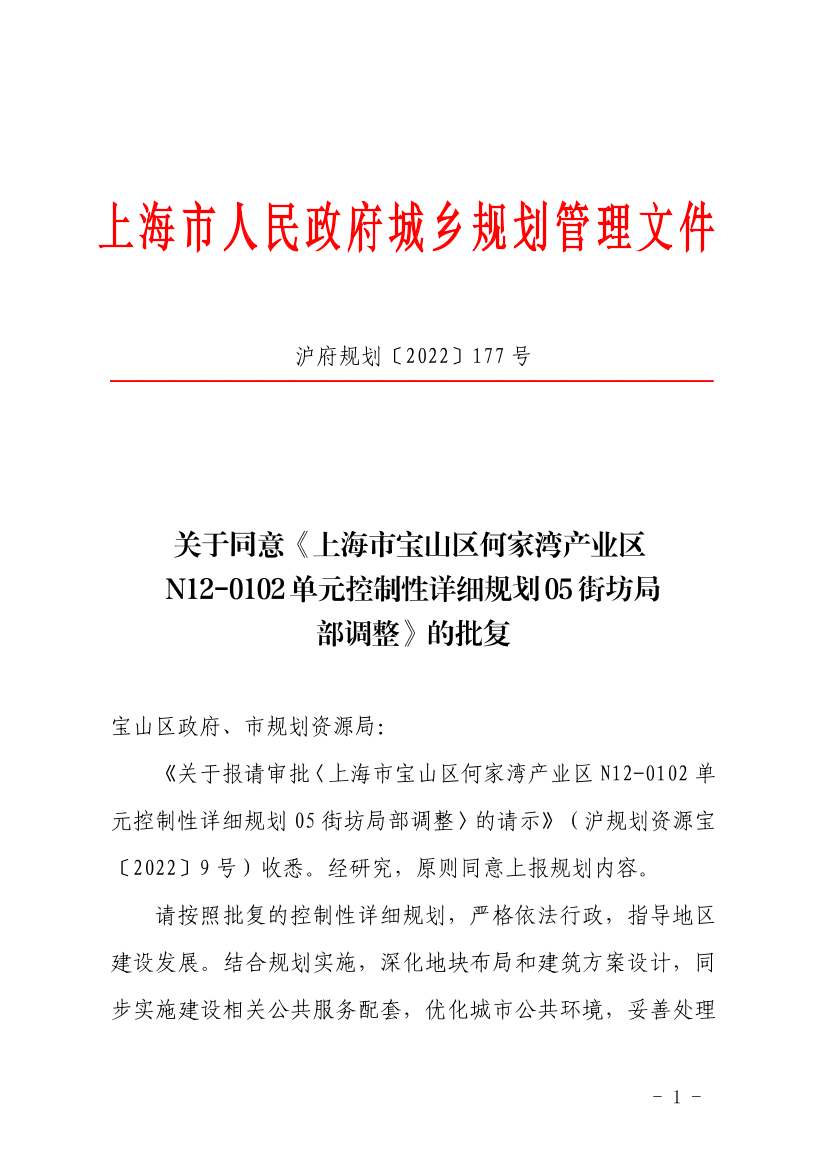 《关于报请审批〈上海市宝山区何家湾产业区N12-0102单元控制性详细规划05街坊局部调整〉的请示》(沪规划资源宝〔2022〕9号)收悉。经研究,原则同意上报规划内容。