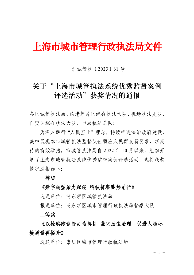 关于“上海市城管执法系统优秀监督案例评选活动”获奖情况的通报