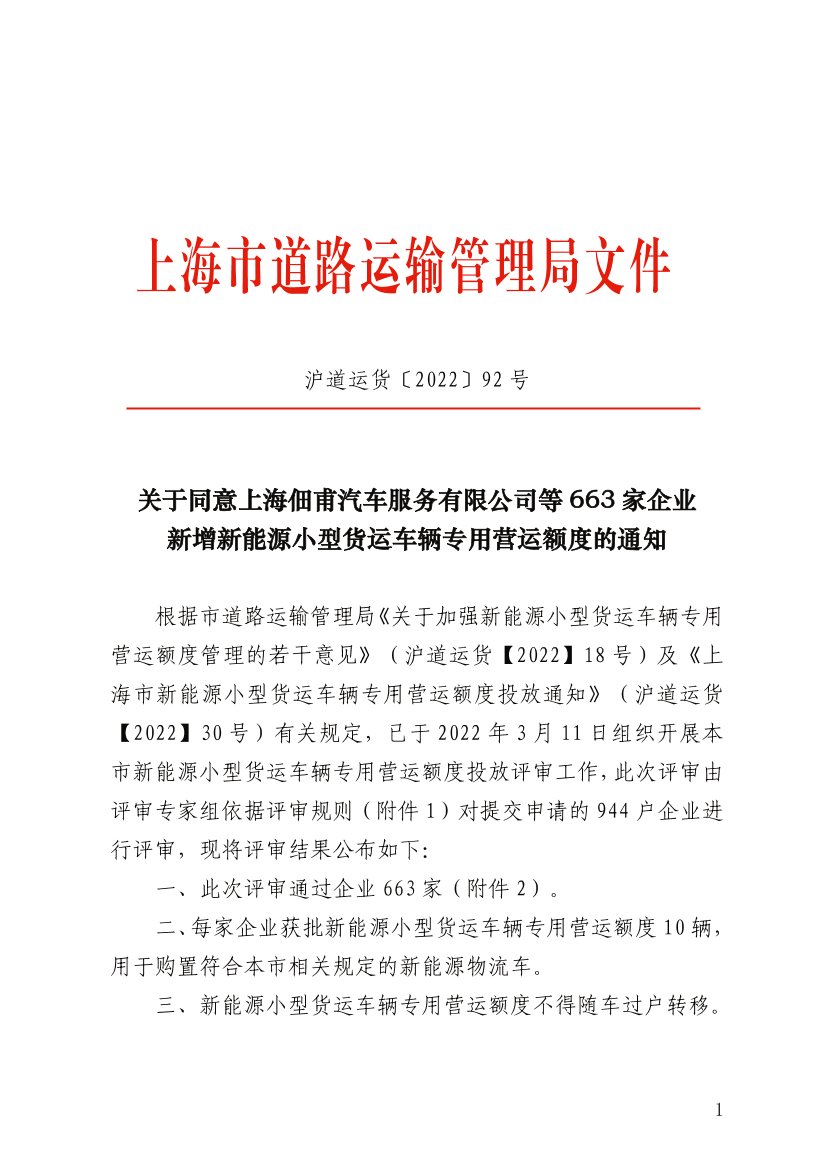 根据市道路运输管理局《关于加强新能源小型货运车辆专用营运额度管理的若干意见》(沪道运货【2022】18号)及《上海市新能源小型货运车辆专用营运额度投放通知》(沪道运货【2022】30号)有关规定,已于2022年3月11日组织开展本市新能源小型货运车辆专用营运额度投放评审工作,此次评审由评审专家组依据评审规则(附件1)对提交申请的944户企业进行评审,现将评审结果公布如下: