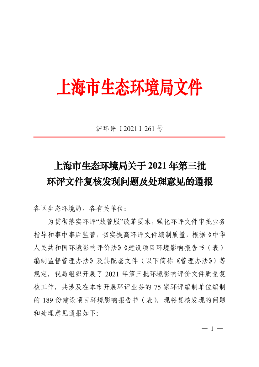 为贯彻落实环评“放管服”改革要求,强化环评文件审批业务指导和事中事后监管,切实提高环评文件编制质量,根据《中华人民共和国环境影响评价法》《建设项目环境影响报告书(表)编制监督管理办法》及其配套文件(以下简称《管理办法》)等规定,我局组织开展了2021年第三批环境影响评价文件质量复核工作,共涉及在本市开展环评业务的75家环评编制单位编制的189份建设项目环境影响报告书(表)。现将复核发现的问题和处理意见通报如下: