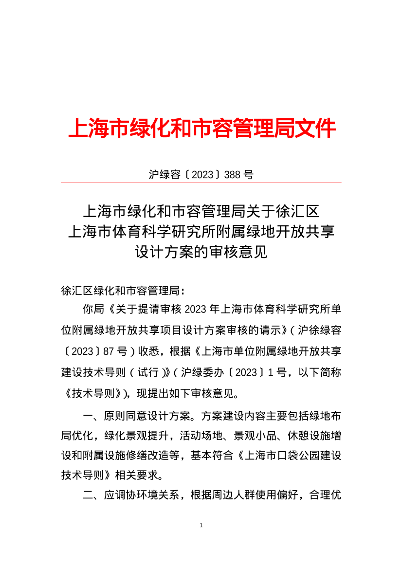 你局《关于提请审核2023年上海市体育科学研究所单位附属绿地开放共享项目设计方案审核的请示》(沪徐绿容〔2023〕87号)收悉,根据《上海市单位附属绿地开放共享建设技术导则(试行)》(沪绿委办〔2023〕1号,以下简称《技术导则》),现提出如下审核意见。