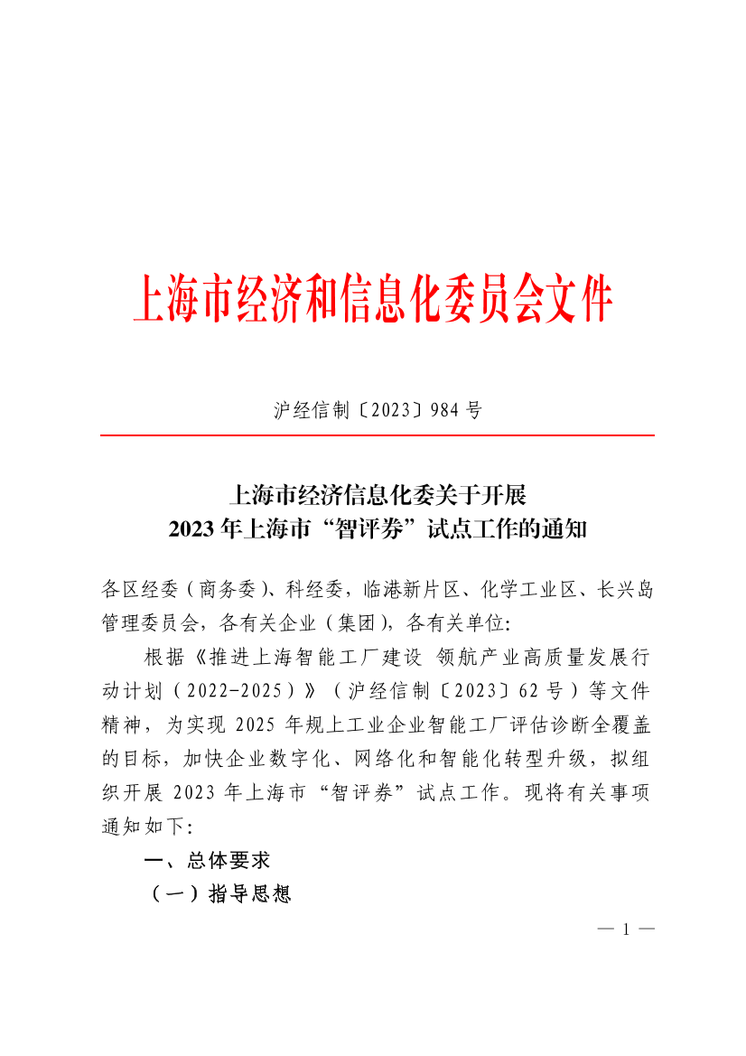 根据《推进上海智能工厂建设 领航产业高质量发展行动计划(2022-2025)》(沪经信制〔2023〕62号)等文件精神,为实现2025年规上工业企业智能工厂评估诊断全覆盖的目标,加快企业数字化、网络化和智能化转型升级,拟组织开展2023年上海市“智评券”试点工作。现将有关事项通知如下: