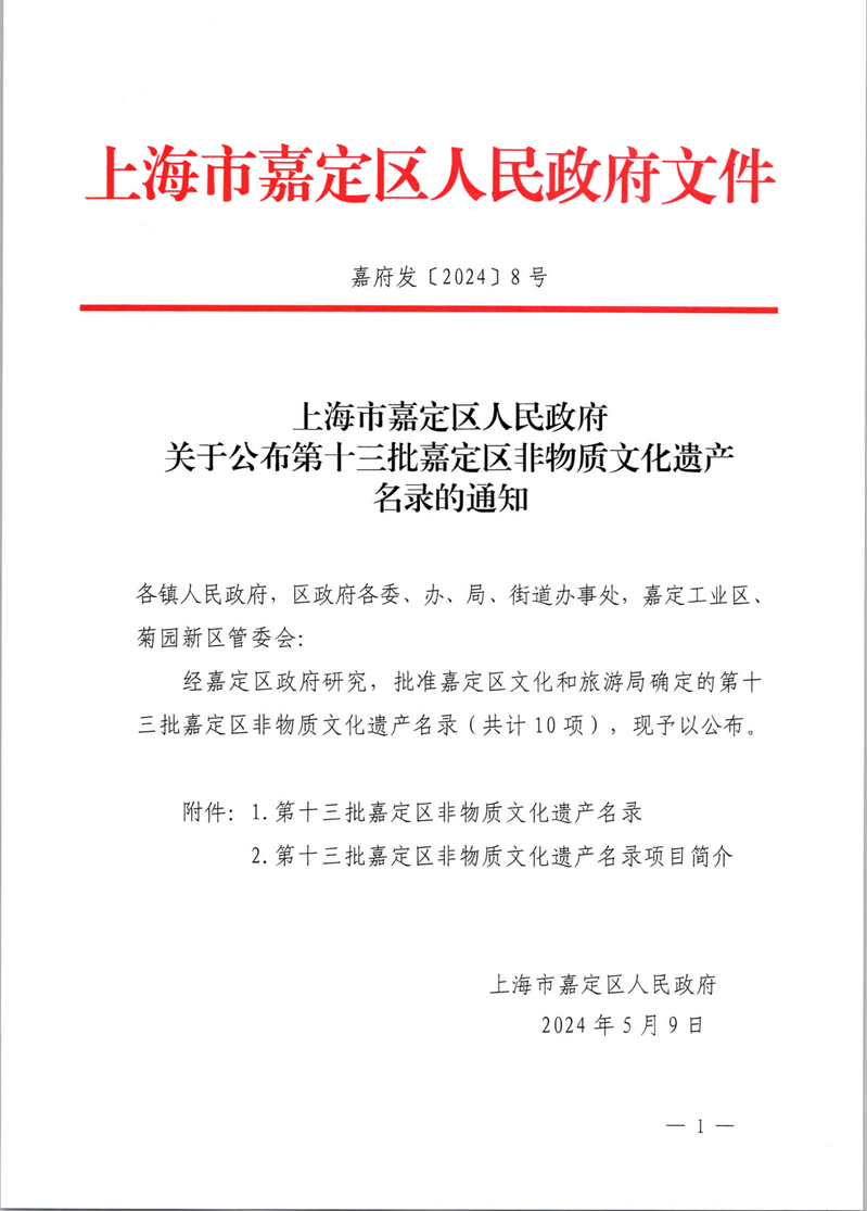 经嘉定区政府研究,批准嘉定区文化和旅游局确定的第十三批嘉定区非物质文化遗产名录(共计10项),现予以公布。