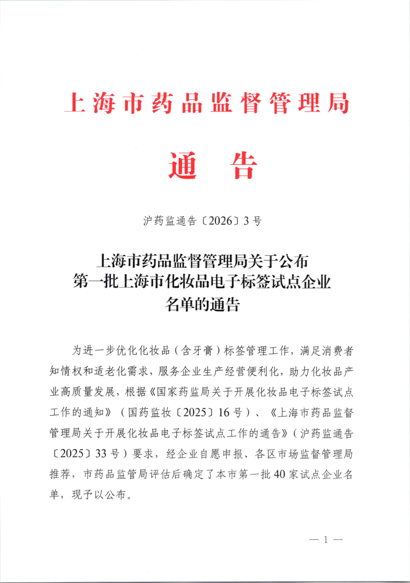 为进一步优化化妆品(含牙膏)标签管理工作,满足消费者知情权和适老化需求,服务企业生产经营便利化,助力化妆品产业高质量发展,根据《国家药监局关于开展化妆品电子标签试点工作的通知》(国药监妆〔2025〕16号)、《上海市药品监督管理局关于开展化妆品电子标签试点工作的通告》(沪药监通告〔2025〕33号)要求,经企业自愿申报、各区市场监督管理局推荐,市药品监管局评估后确定了本市第一批40家试点企业名单,现予以公布。