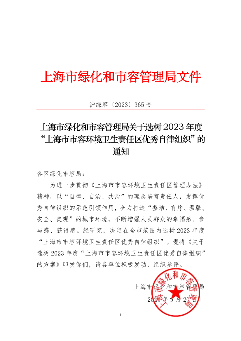 为进一步贯彻《上海市市容环境卫生责任区管理办法》精神,以“自律、自治、共治”的理念培育责任人,发挥优秀自律组织的示范引领作用,全力打造“整洁、有序、温馨、安全、美观”的城市环境,不断增强人民群众的幸福感、参与感、获得感。经研究,决定在全市范围内选树2023年度“上海市市容环境卫生责任区优秀自律组织”。现将《关于选树2023年度“上海市市容环境卫生责任区优秀自律组织”的方案》印发你们,请各单位积极发动,组织参评。