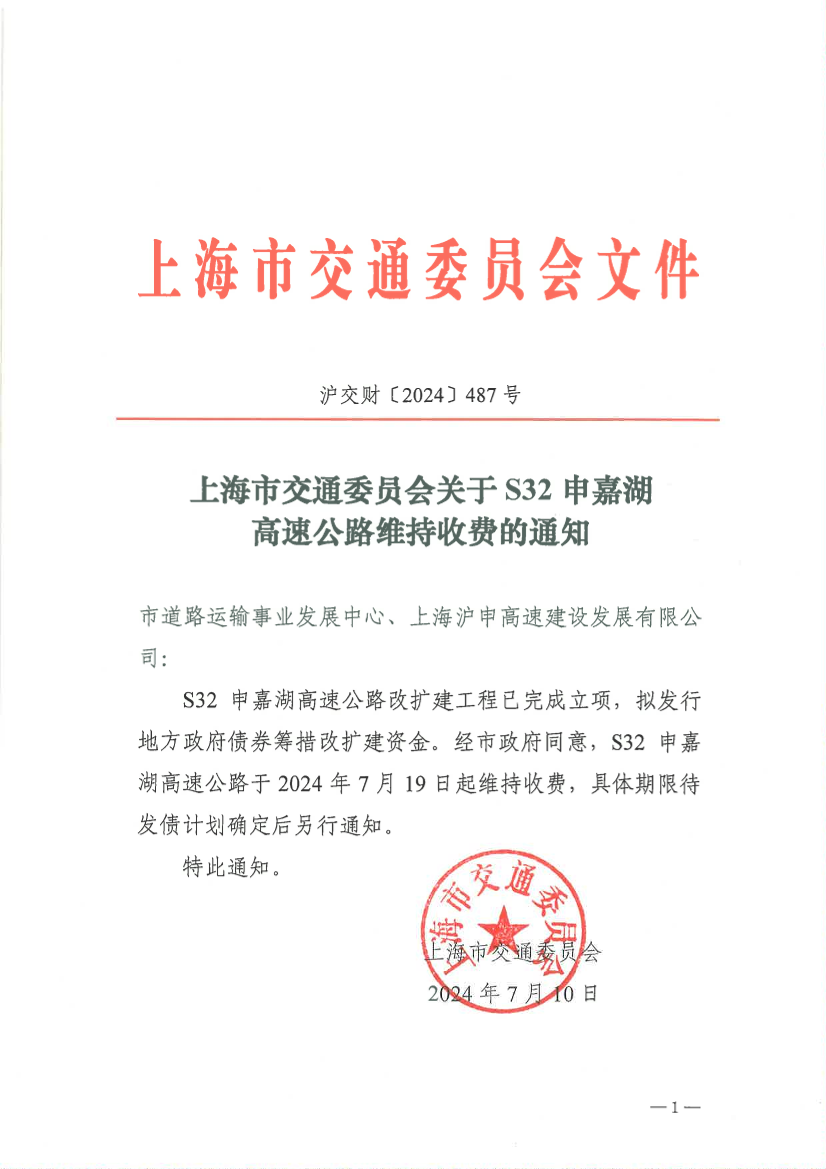 S32申嘉湖高速公路改扩建工程已完成立项,拟发行地方政府债券筹措改扩建资金。经市政府同意,S32申嘉湖高速公路于2024年7月19日起维持收费,具体期限待发债计划确定后另行通知。