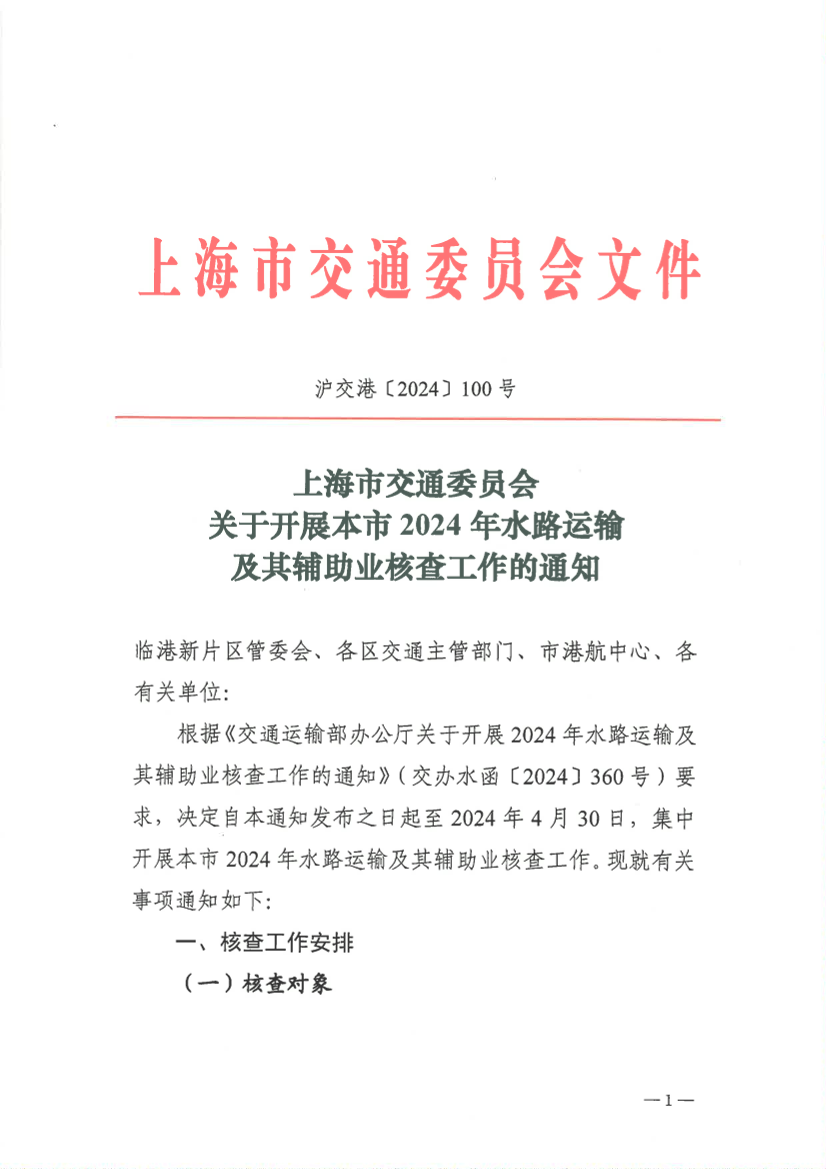 根据《交通运输部办公厅关于开展2024年水路运输及其辅助业核查工作的通知》(交办水函〔2024〕360号)要求,决定自本通知发布之日起至2024年4月30日,集中开展本市2024年水路运输及其辅助业核查工作。现就有关事项通知如下: