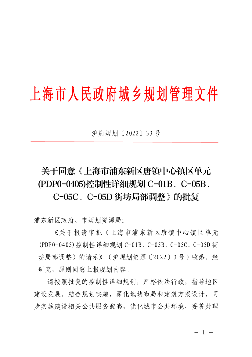 《关于报请审批〈上海市浦东新区唐镇中心镇区单元(PDP0-0405)控制性详细规划C-01B、C-05B、C-05C、C-05D街坊局部调整〉的请示》(沪规划资源〔2022〕3号)收悉。经研究,原则同意上报规划内容。