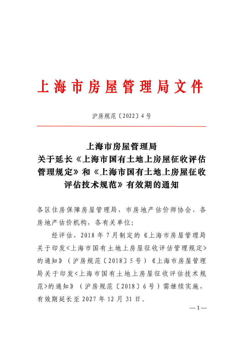 经评估,2018年7月制定的《上海市房屋管理局关于印发<上海市国有土地上房屋征收评估管理规定>的通知》(沪房规范〔2018〕5号)《上海市房屋管理局关于印发<上海市国有土地上房屋征收评估技术规范>的通知》(沪房规范〔2018〕6号)需继续实施,有效期延长至2027年12月31日。