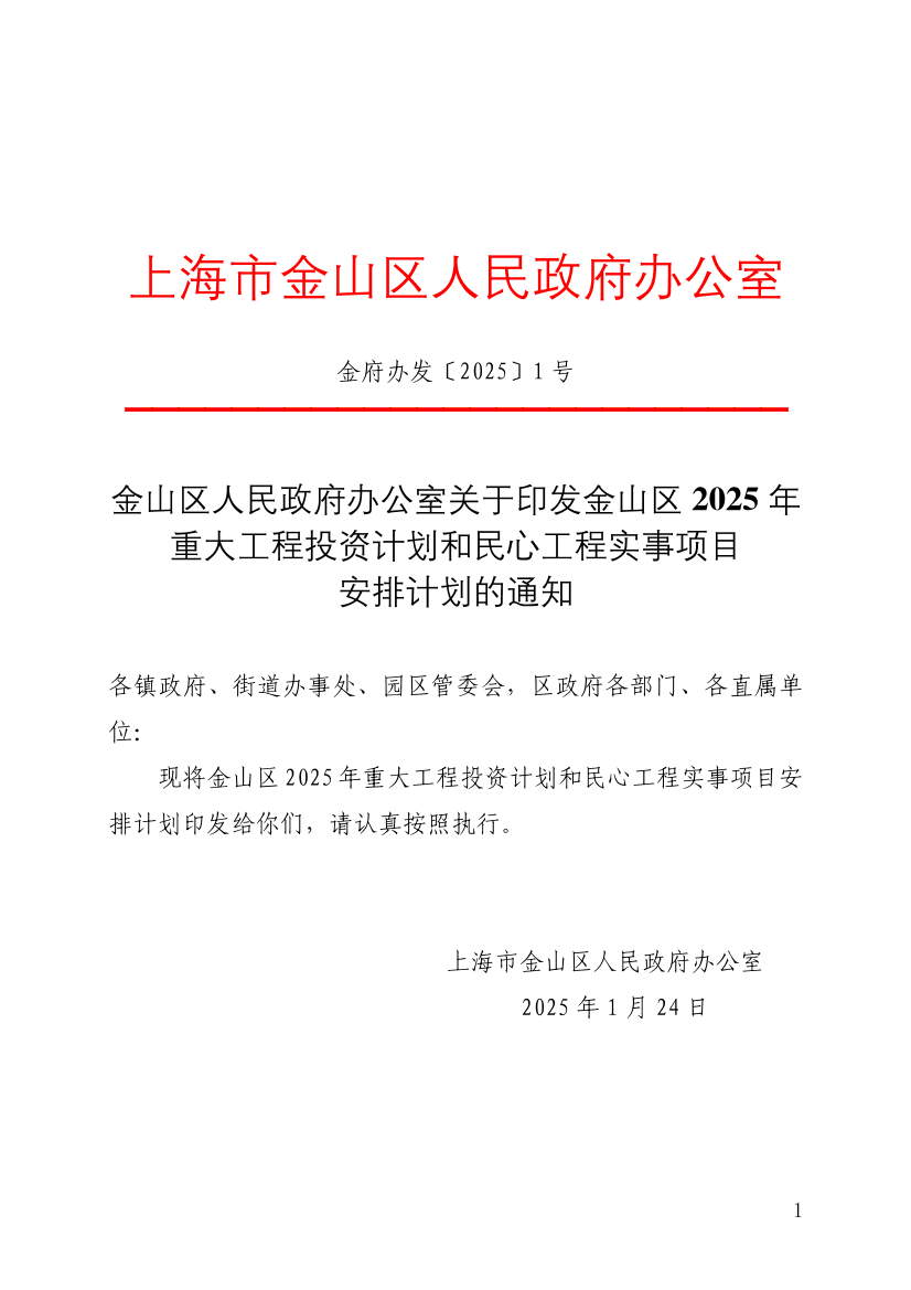 现将金山区2025年重大工程投资计划和民心工程实事项目安排计划印发给你们,请认真按照执行。