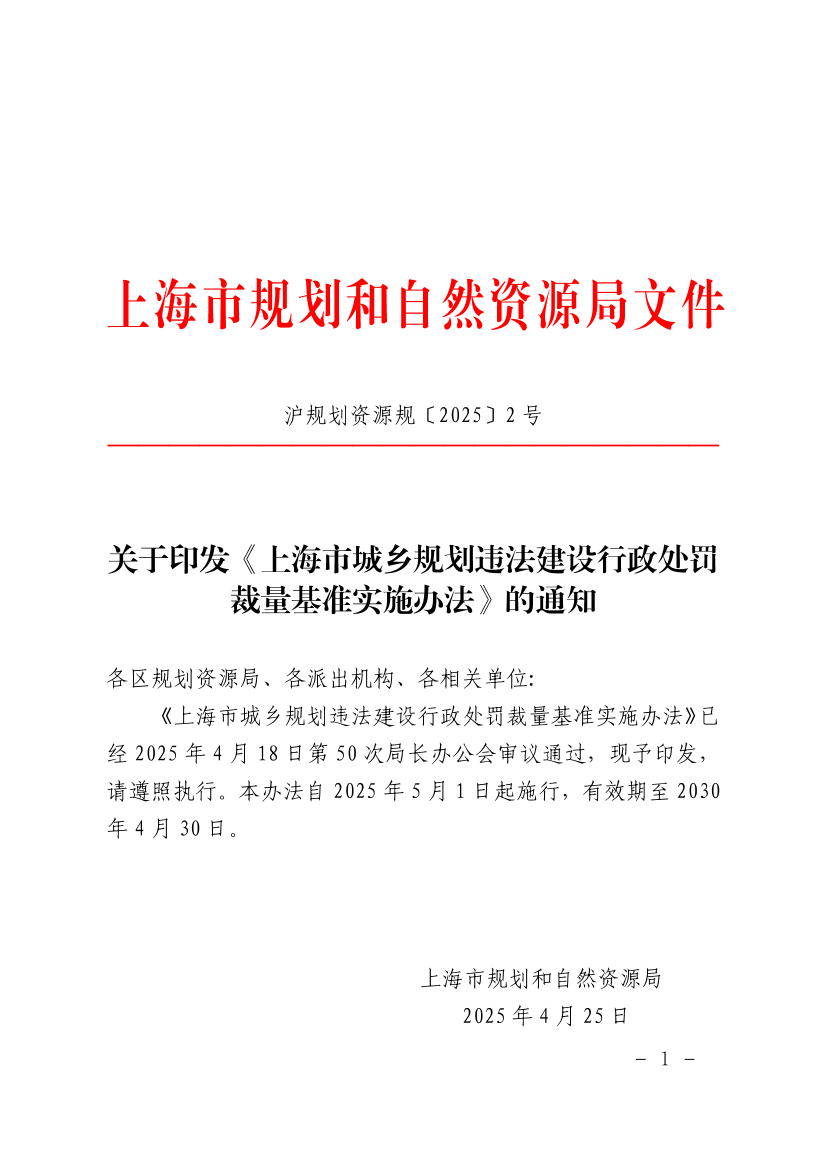 《上海市城乡规划违法建设行政处罚裁量基准实施办法》已经2025年4月18日第50次局长办公会审议通过,现予印发,请遵照执行。本办法自2025年5月1日起施行,有效期至2030年4月30日。