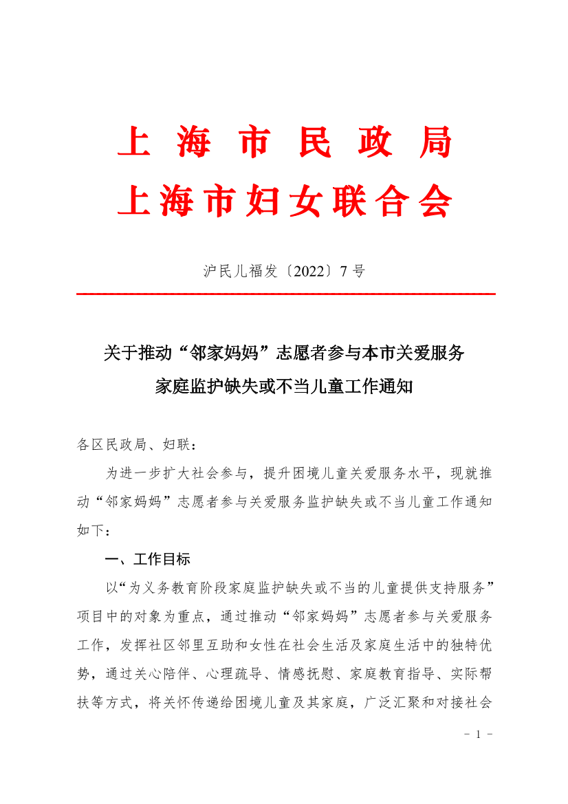为进一步扩大社会参与,提升困境儿童关爱服务水平,现就推动“邻家妈妈”志愿者参与关爱服务监护缺失或不当儿童工作通知如下: