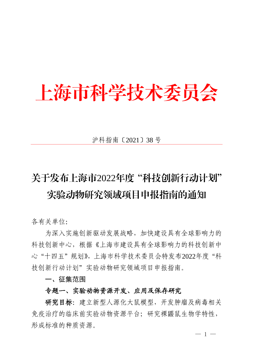 为深入实施创新驱动发展战略,加快建设具有全球影响力的科技创新中心,根据《上海市建设具有全球影响力的科技创新中心“十四五”规划》,上海市科学技术委员会特发布2022年度“科技创新行动计划”实验动物研究领域项目申报指南。