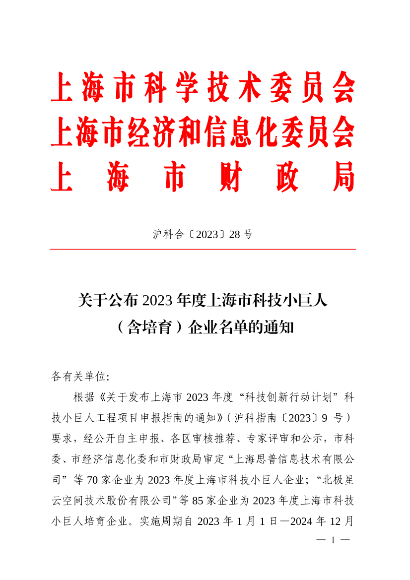 根据《关于发布上海市2023年度“科技创新行动计划”科技小巨人工程项目申报指南的通知》(沪科指南〔2023〕9号)要求,经公开自主申报、各区审核推荐、专家评审和公示,市科委、市经济信息化委和市财政局审定“上海思普信息技术有限公司”等70家企业为2023年度上海市科技小巨人企业;“北极星云空间技术股份有限公司”等85家企业为2023年度上海市科技小巨人培育企业。实施周期自2023年1月1日—2024年12月31日,实施期结束后按要求进行综合绩效评价,并根据评价结果择优资助。
