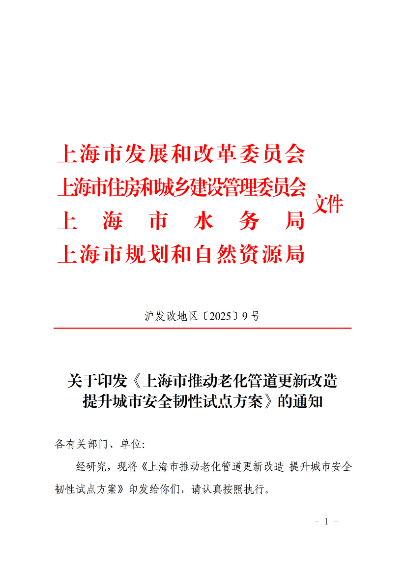 经研究,现将《上海市推动老化管道更新改造 提升城市安全韧性试点方案》印发给你们,请认真按照执行。