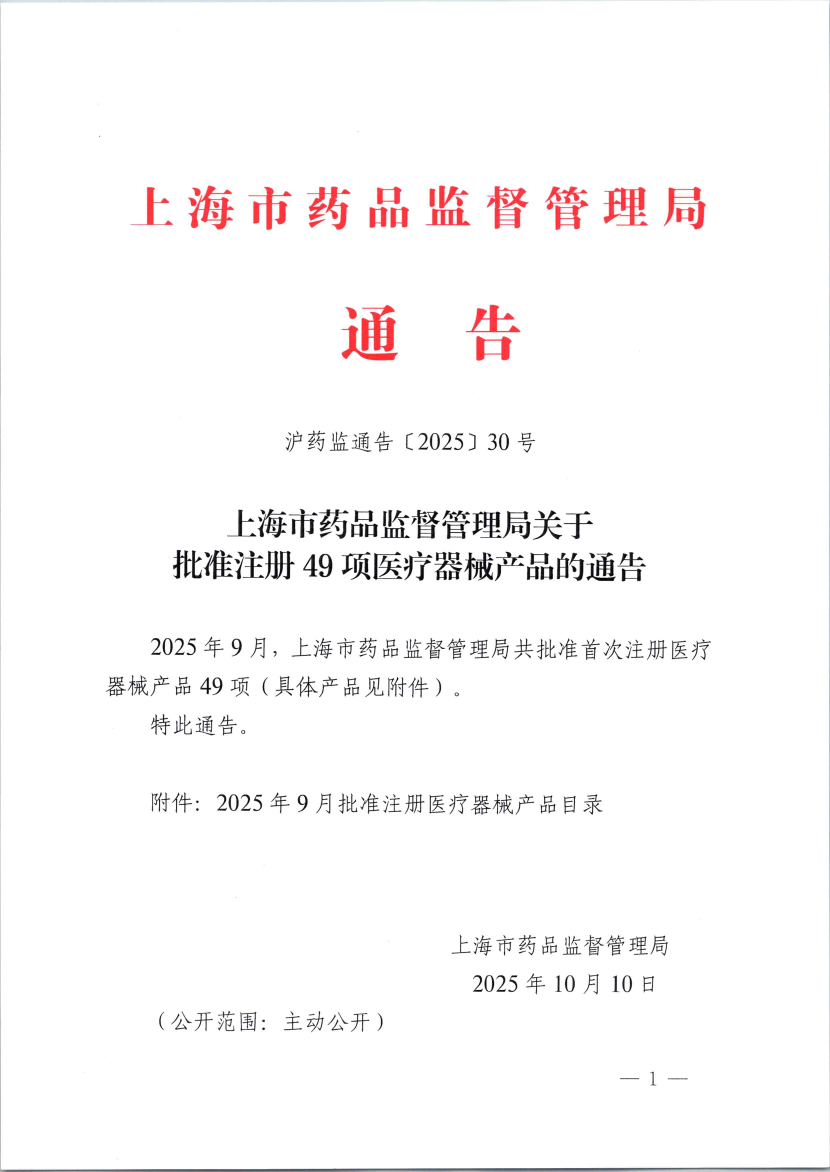 2025年9月,上海市药品监督管理局共批准首次注册医疗器械产品49项(具体产品见附件)。