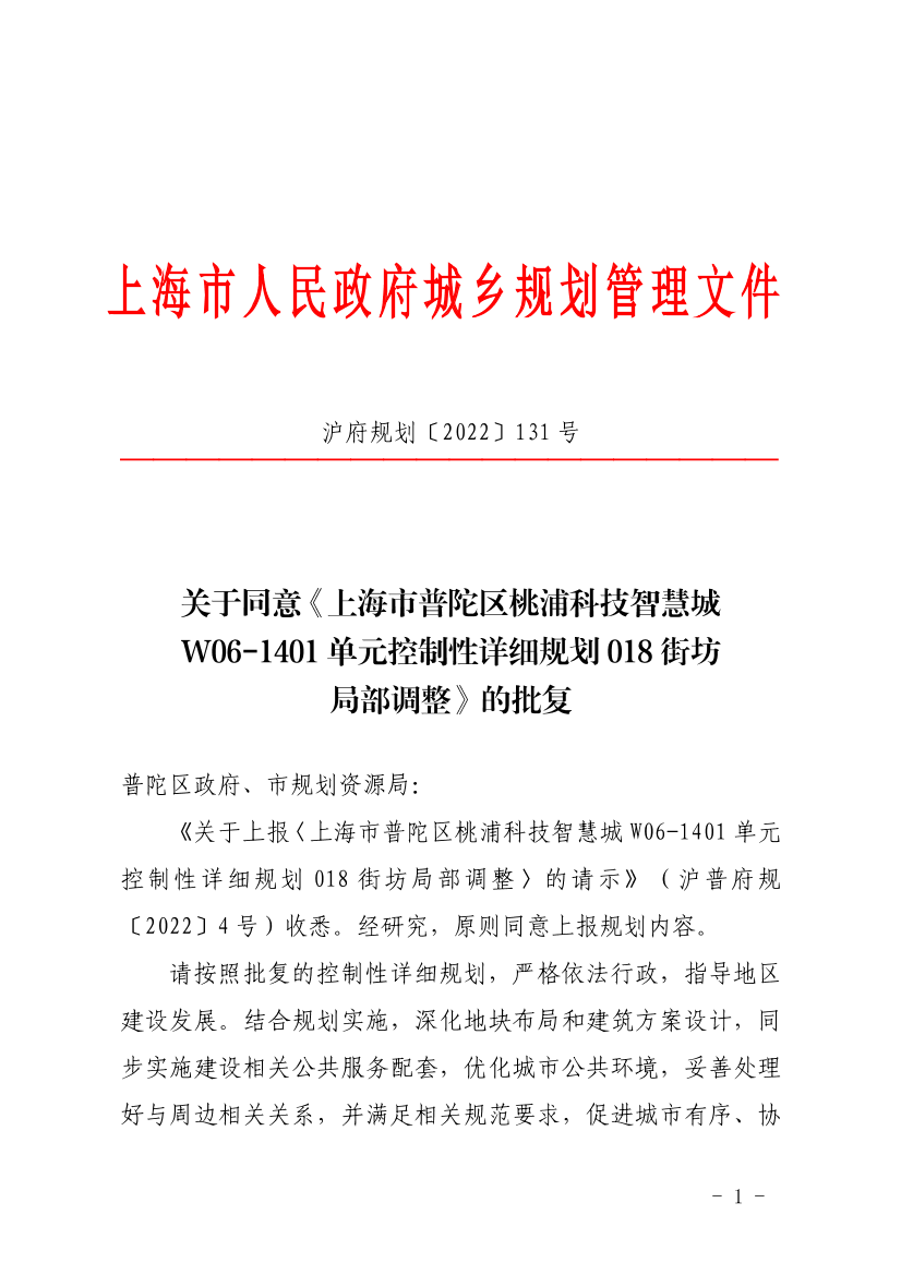 《关于上报〈上海市普陀区桃浦科技智慧城W06-1401单元控制性详细规划018街坊局部调整〉的请示》(沪普府规〔2022〕4号)收悉。经研究,原则同意上报规划内容。