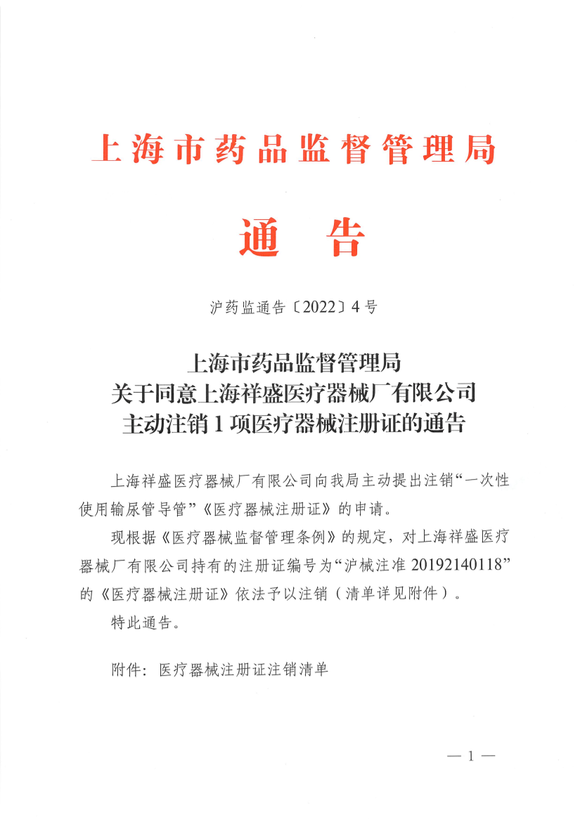 上海祥盛医疗器械厂有限公司向我局主动提出注销“一次性使用输尿管导管”《医疗器械注册证》的申请。
