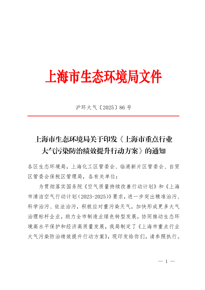 为贯彻落实国务院《空气质量持续改善行动计划》和《上海市清洁空气行动计划(2023-2025)》要求,进一步突出精准治污、科学治污、依法治污,积极应对重污染天气,加快形成更多大气治理标杆企业,助力全市制造业绿色转型发展,协同推动生态环境高水平保护和经济高质量发展,我局制定了《上海市重点行业大气污染防治绩效提升行动方案》,现印发给你们,请参照执行。