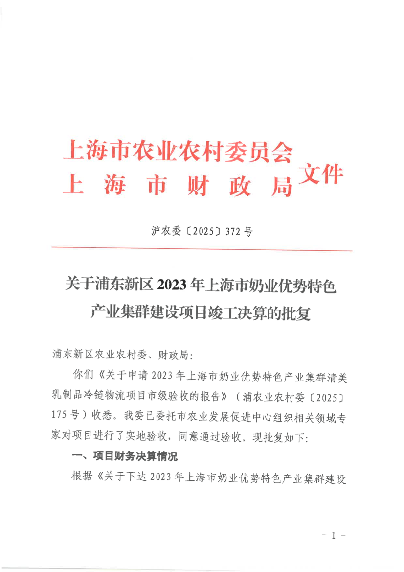 你们《关于申请2023年上海市奶业优势特色产业集群清美乳制品冷链物流项目市级验收的报告》(浦农业农村委〔2025〕175号)收悉。我委已委托市农业发展促进中心组织相关领域专家对项目进行了实地验收,同意通过验收。现批复如下: