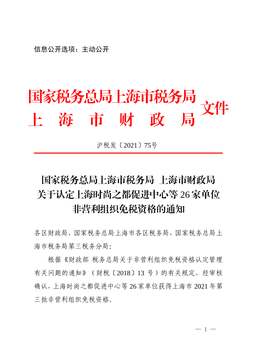 根据《财政部 税务总局关于非营利组织免税资格认定管理有关问题的通知》(财税〔2018〕13号)的有关规定,经审核确认,上海时尚之都促进中心等26家单位获得上海市2021年第三批非营利组织免税资格。