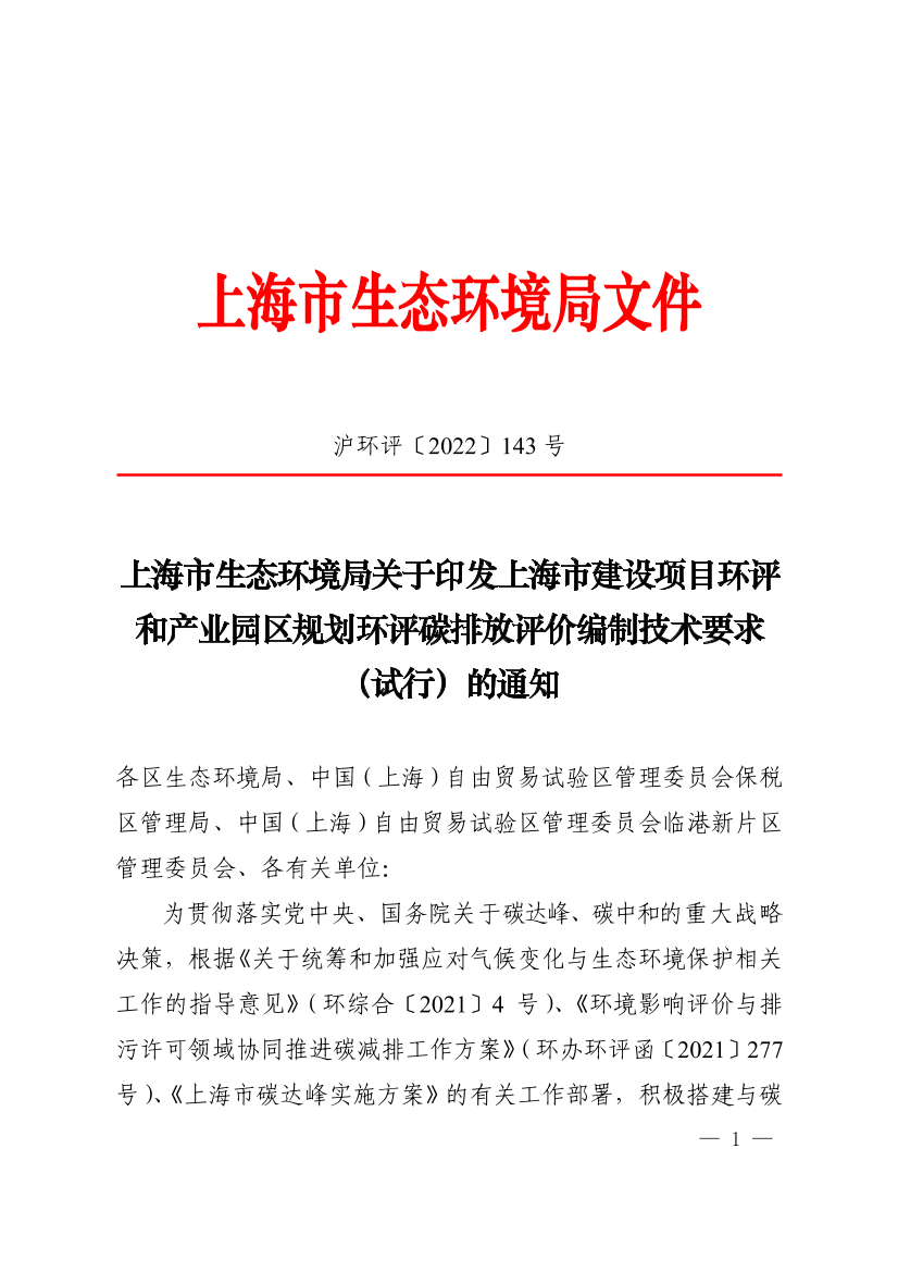 为贯彻落实党中央、国务院关于碳达峰、碳中和的重大战略决策,根据《关于统筹和加强应对气候变化与生态环境保护相关工作的指导意见》(环综合〔2021〕4号)、《环境影响评价与排污许可领域协同推进碳减排工作方案》(环办环评函〔2021〕277号)、《上海市碳达峰实施方案》的有关工作部署,积极搭建与碳达峰目标相适应的环境影响评价制度,我局研究制定了《上海市建设项目环评碳排放评价编制技术要求(试行)》和《上海市产业园区规划环评碳排放评价编制技术要求(试行)》,现将有关工作要求通知如下。