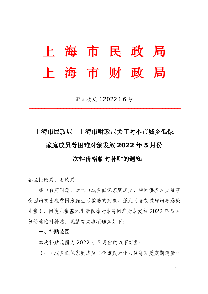 经市政府同意,对本市城乡低保家庭成员、特困供养人员及享受因病支出型贫困家庭生活救助的对象、孤儿(含艾滋病病毒感染儿童)、困境儿童基本生活保障对象等困难对象发放2022年5月份价格临时补贴。现就有关事项通知如下:
