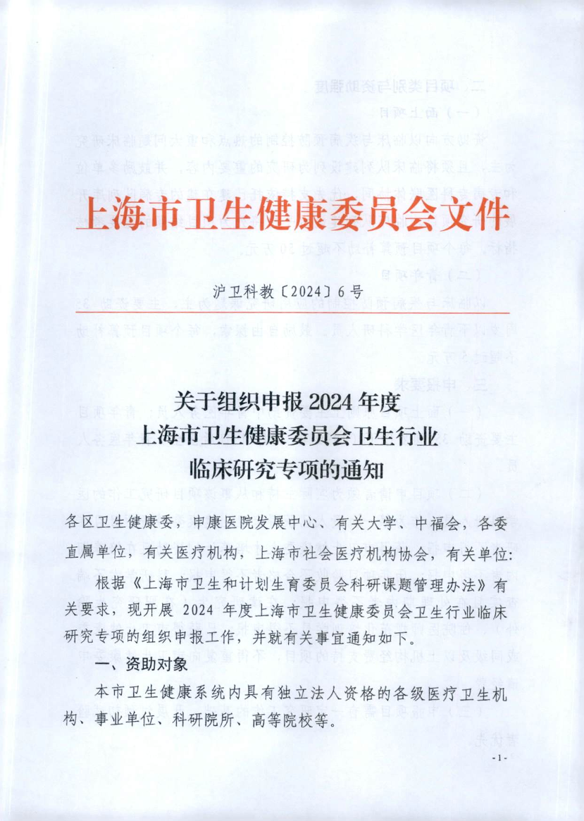 根据《上海市卫生和计划生育委员会科研课题管理办法》有关要求,现开展2024年度上海市卫生健康委员会卫生行业临床研究专项的组织申报工作,并就有关事宜通知如下。