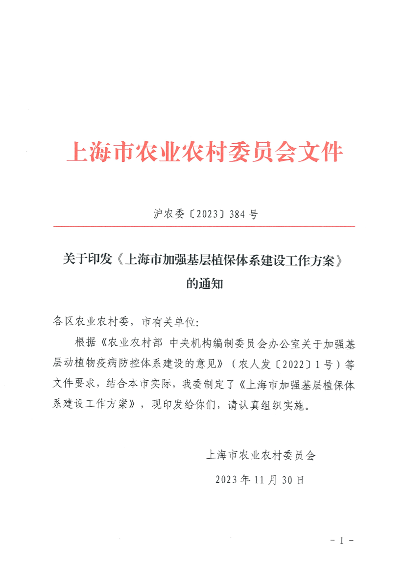 根据《农业农村部 中央机构编制委员会办公室关于加强基层动植物疫病防控体系建设的意见》(农人发〔2022〕1号)等文件要求,结合本市实际,我委制定了《上海市加强基层植保体系建设工作方案》,现印发给你们,请认真组织实施。