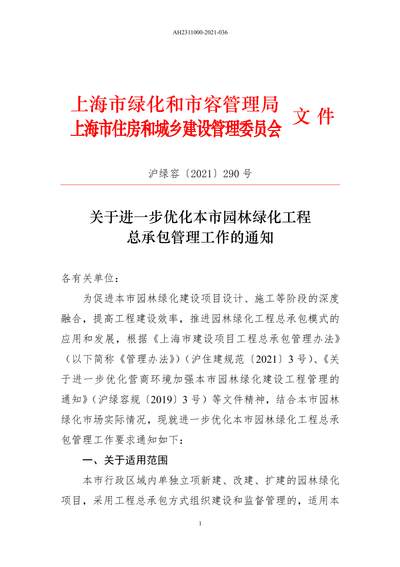 为促进本市园林绿化建设项目设计、施工等阶段的深度融合,提高工程建设效率,推进园林绿化工程总承包模式的应用和发展,根据《上海市建设项目工程总承包管理办法》(以下简称《管理办法》)(沪住建规范〔2021〕3号)、《关于进一步优化营商环境加强本市园林绿化建设工程管理的通知》(沪绿容规〔2019〕3号)等文件精神,结合本市园林绿化市场实际情况,现就进一步优化本市园林绿化工程总承包管理工作要求通知如下: