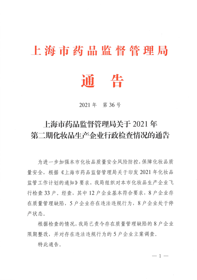 为进一步加强本市化妆品质量安全风险防控,保障化妆品质量安全,根据《上海市药品监督管理局关于印发2021年化妆品监管工作计划的通知》要求,我局组织对本市化妆品生产企业飞行检查33户。经查,其中12户企业基本符合要求,8户企业存在质量管理缺陷,5户企业存在违法违规行为,8户企业处于停产状态。