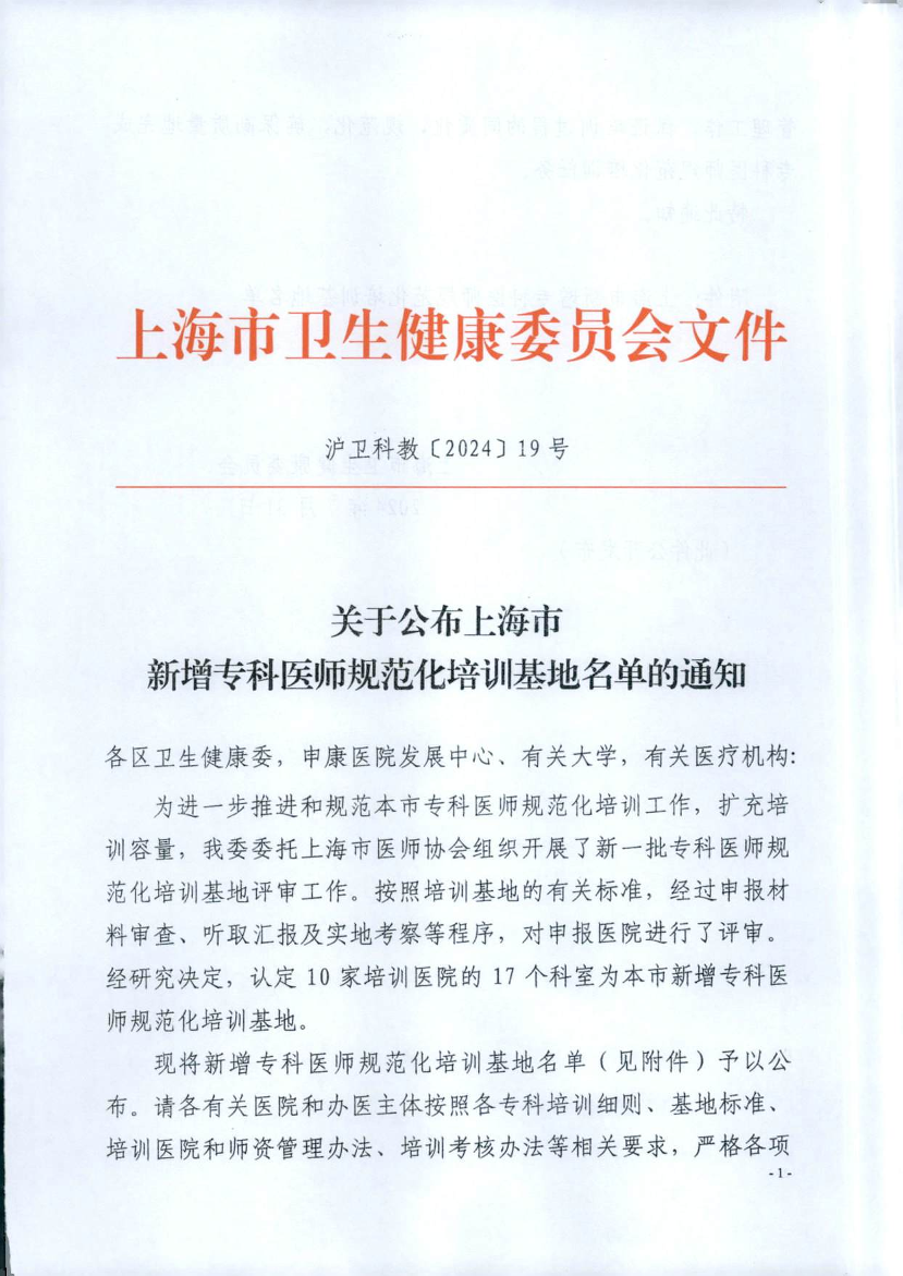 现将新增专科医师规范化培训基地名单(见附件)予以公布。请各有关医院和办医主体按照各专科培训细则、基地标准、培训医院和师资管理办法、培训考核办法等相关要求,严格各项管理工作,保证培训过程的同质化、规范化,确保高质量地完成专科医师规范化培训任务。