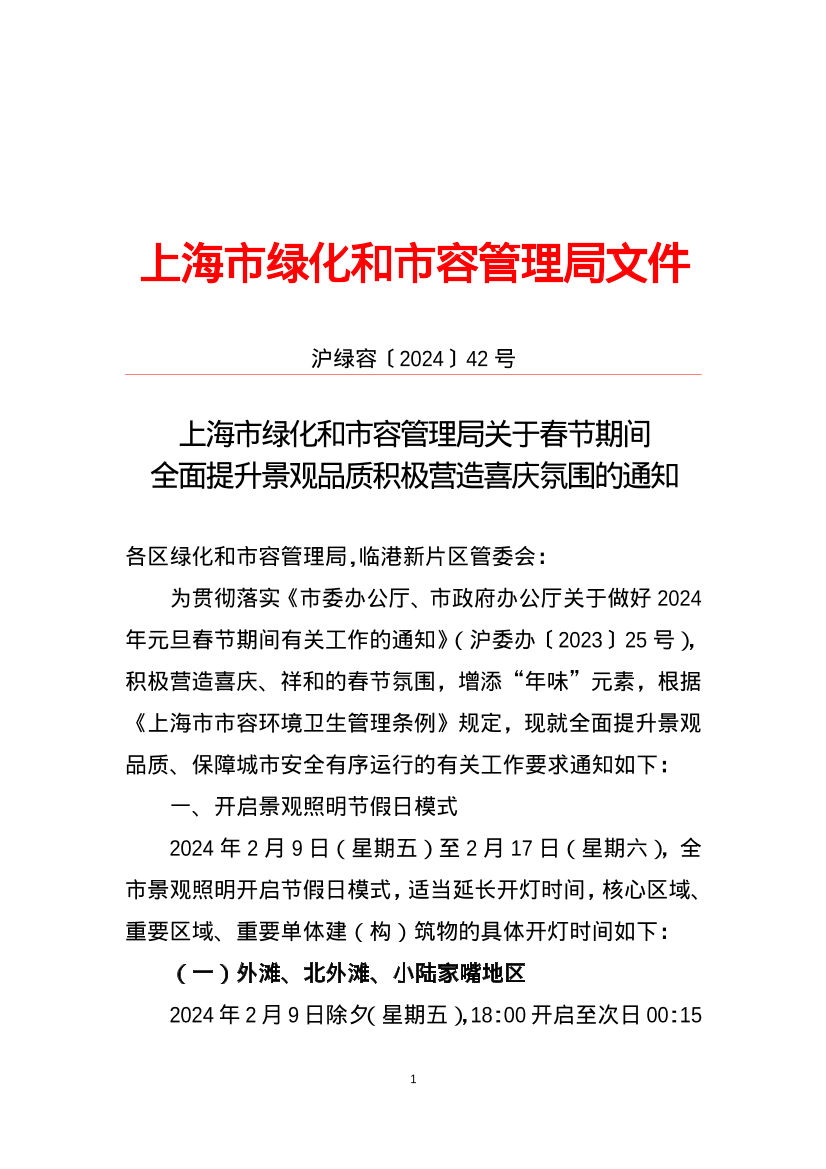 为贯彻落实《市委办公厅、市政府办公厅关于做好2024年元旦春节期间有关工作的通知》(沪委办〔2023〕25号),积极营造喜庆、祥和的春节氛围,增添“年味”元素,根据《上海市市容环境卫生管理条例》规定,现就全面提升景观品质、保障城市安全有序运行的有关工作要求通知如下: