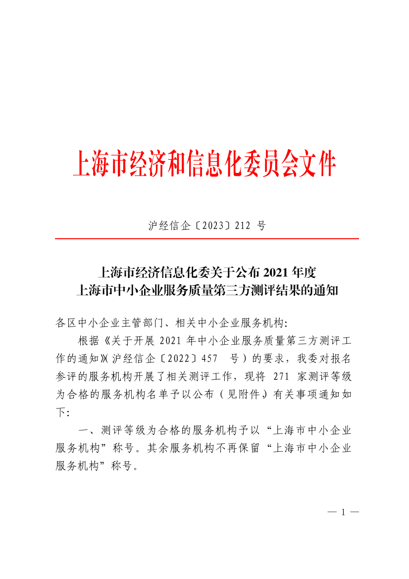 根据《关于开展2021年中小企业服务质量第三方测评工作的通知》(沪经信企〔2022〕457号)的要求,我委对报名参评的服务机构开展了相关测评工作,现将271家测评等级为合格的服务机构名单予以公布(见附件),有关事项通知如下: